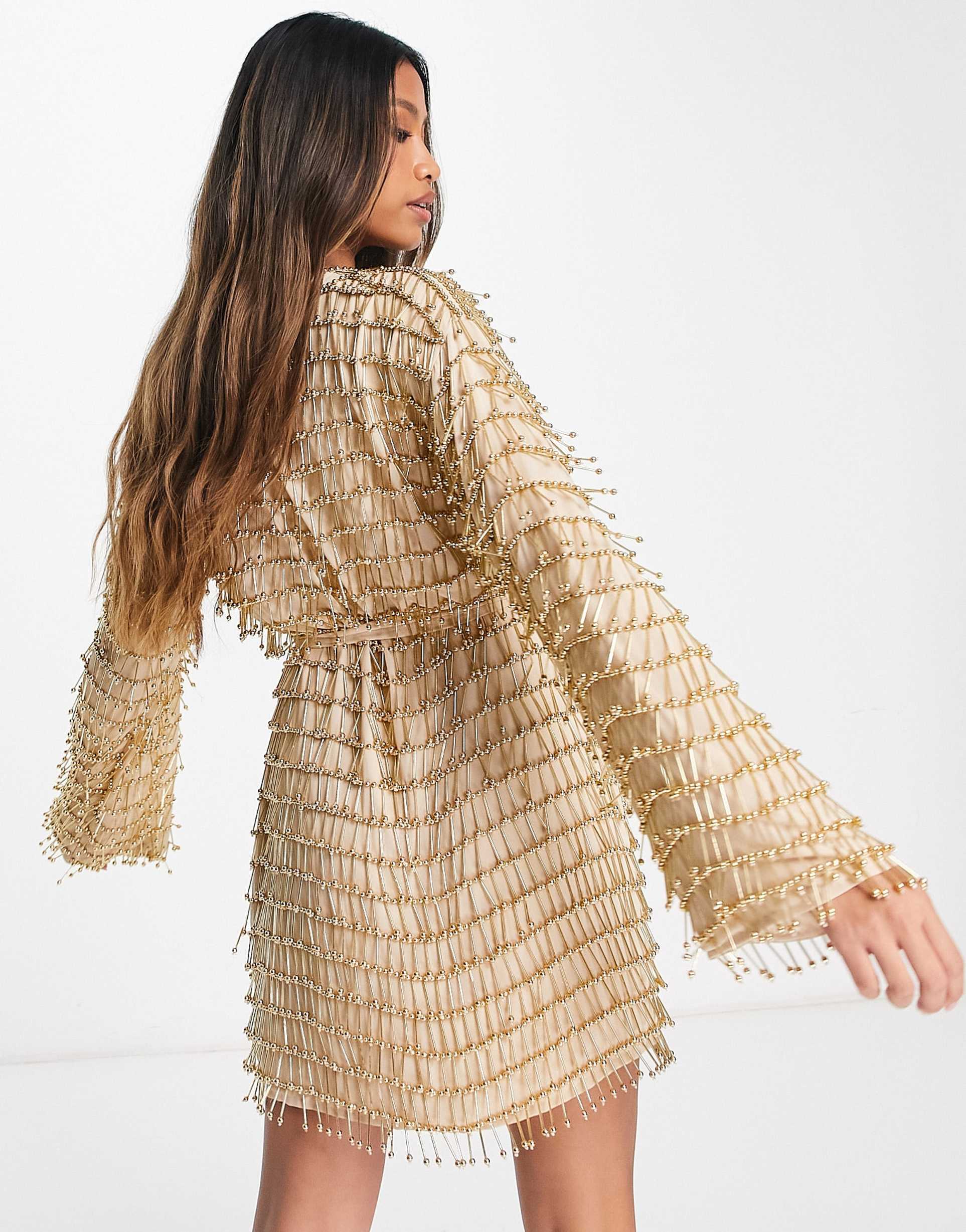 This mini dress features a beaded, plain-woven fabric with a wrap front and long sleeves. It has a glamorous and eye-catching design, perfect for special occasions. Style with heels and minimal jewelry to let the dress shine.