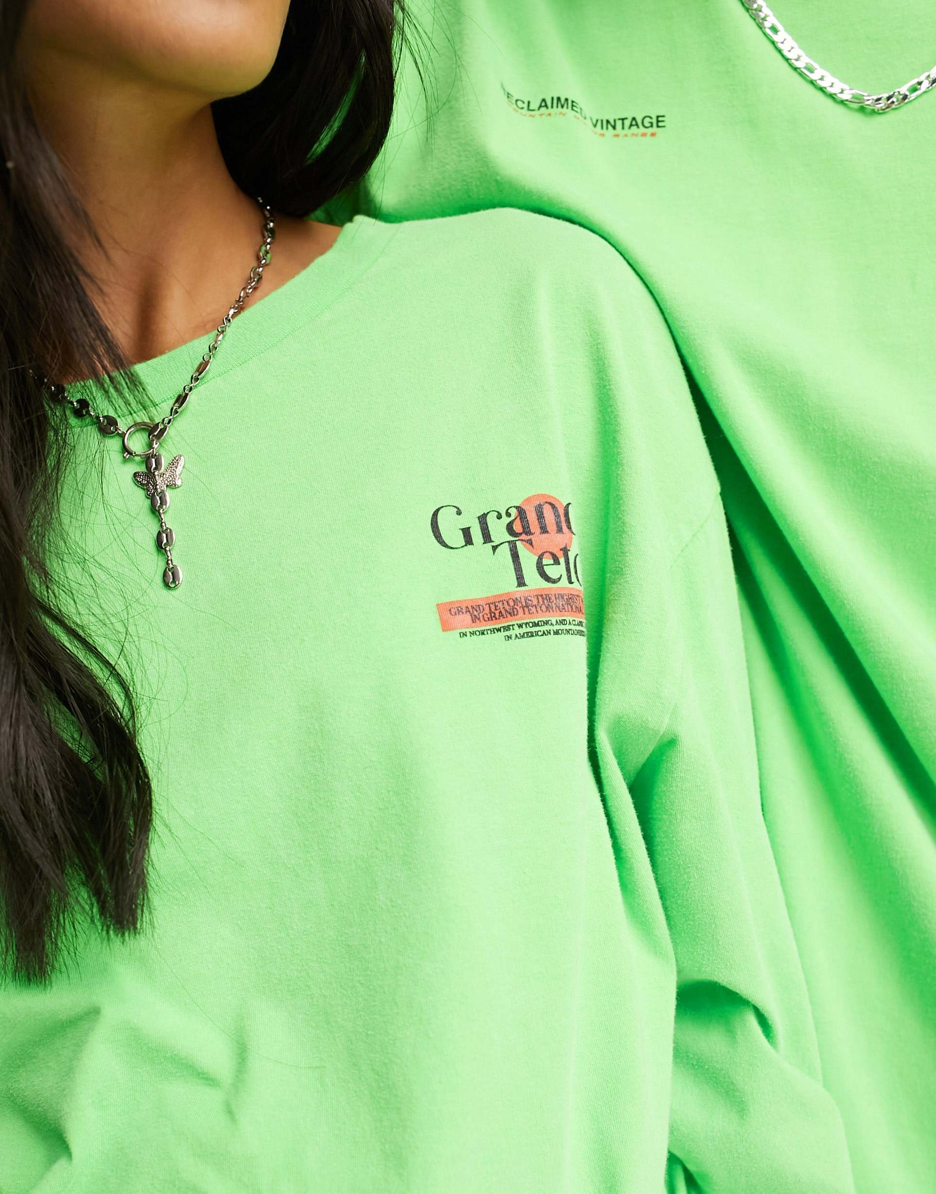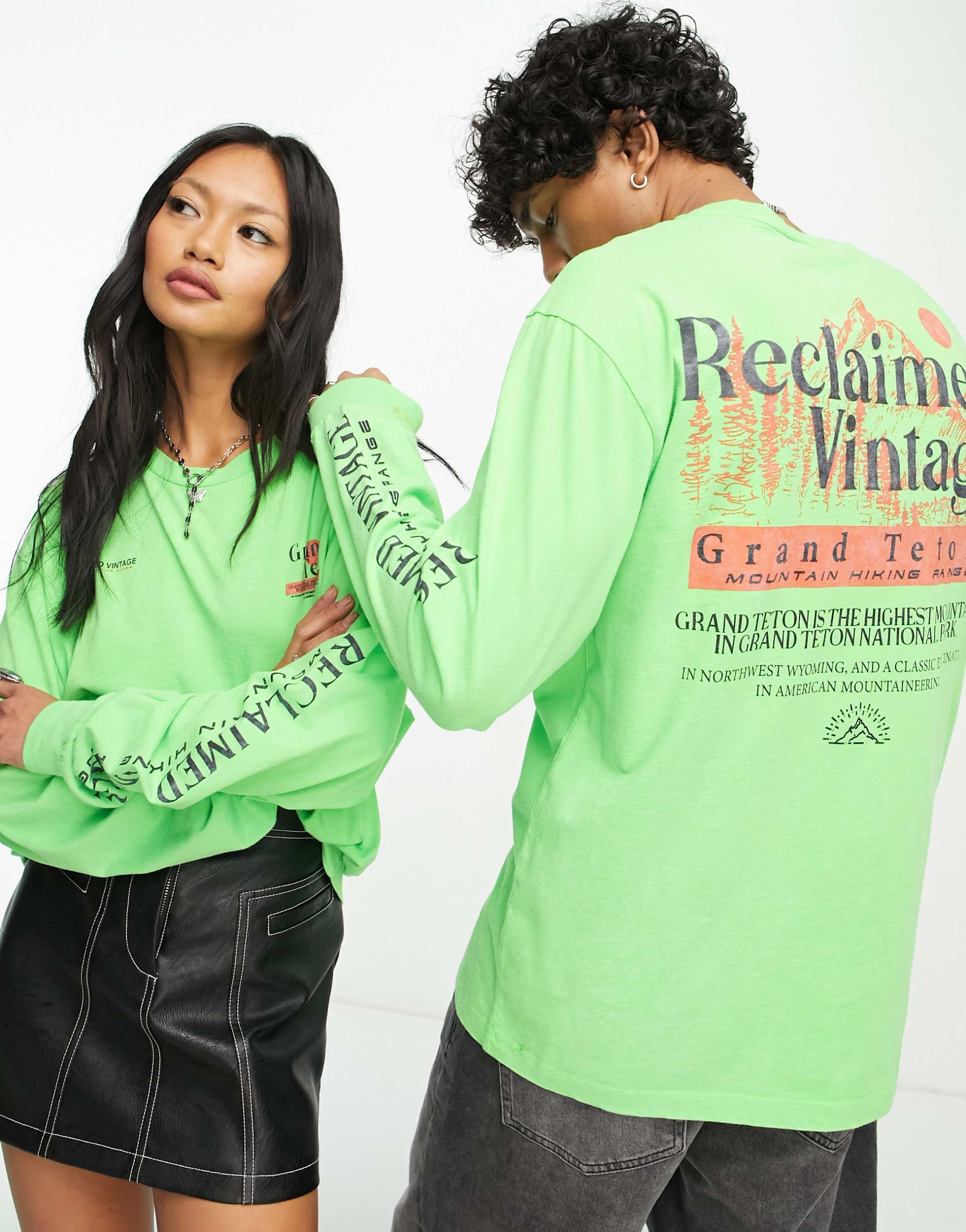 Soft and stretchy jersey tee with chest and back print. Features a crew neck and long sleeves. This unisex style t-shirt offers a regular fit.