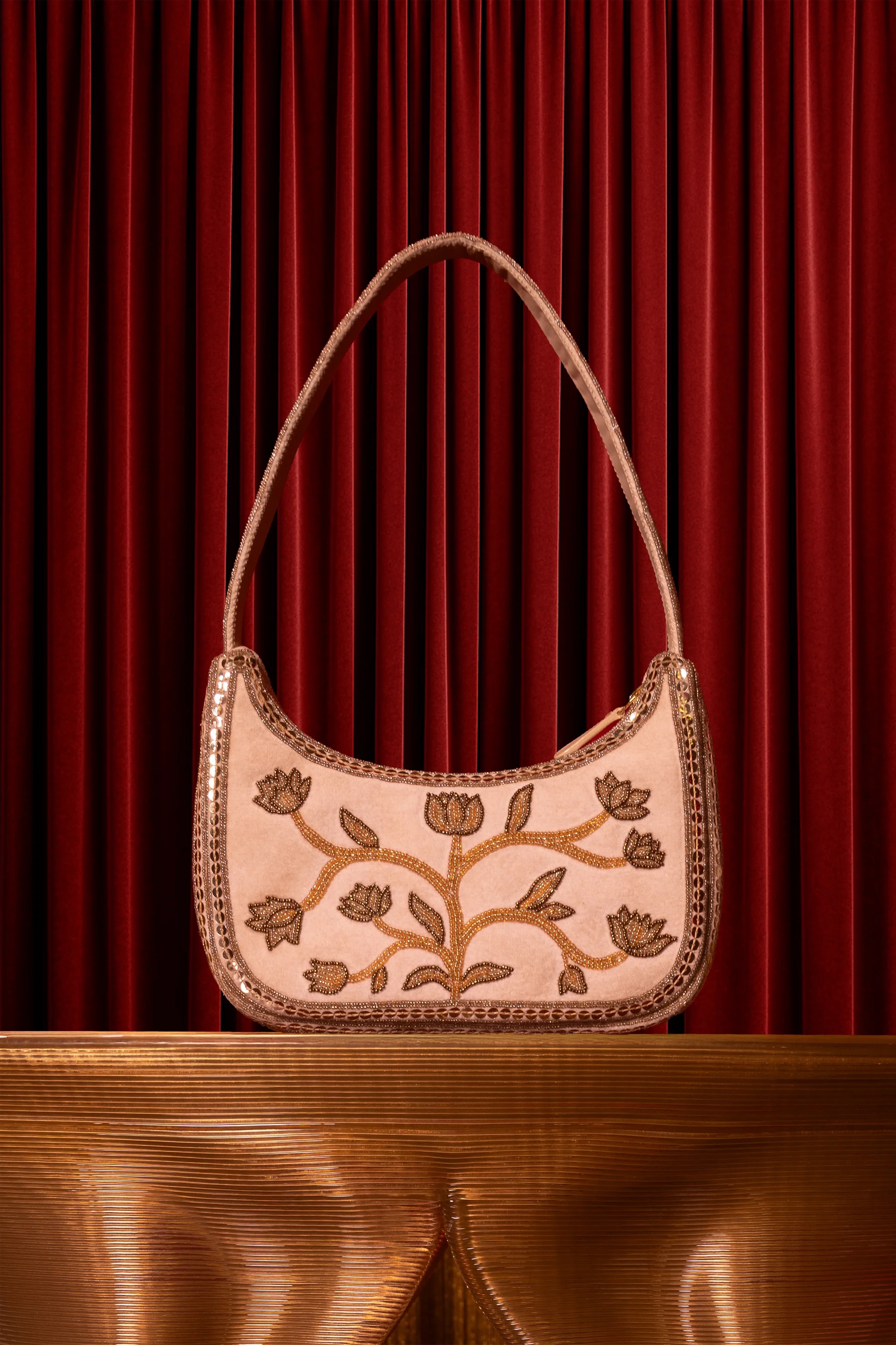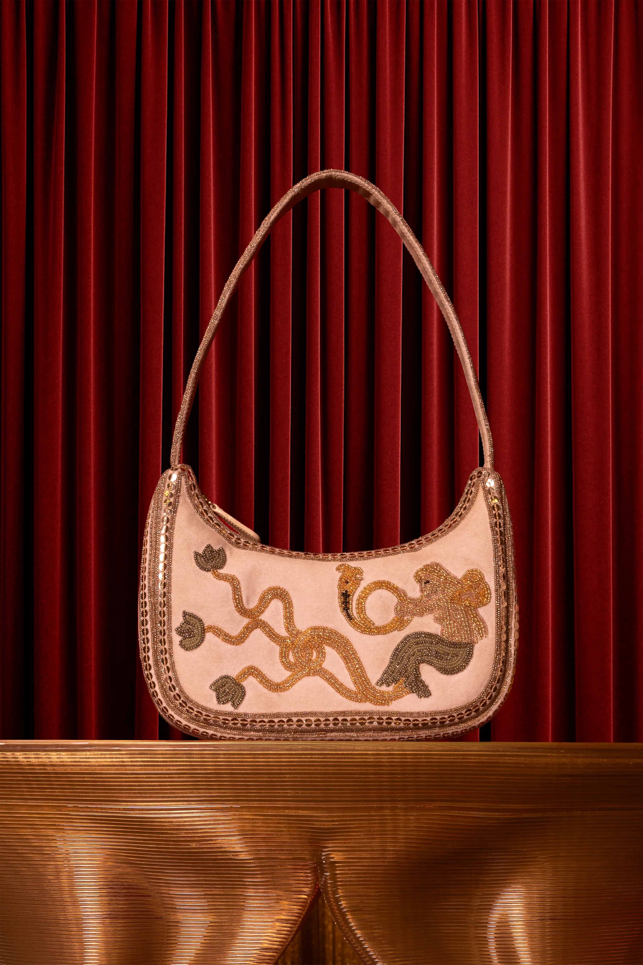 Features an angelic pattern hand-embroidered with shimmering beads. It includes a matching embroidered strap and a metal zipper. It also has a small inner pocket for essentials.