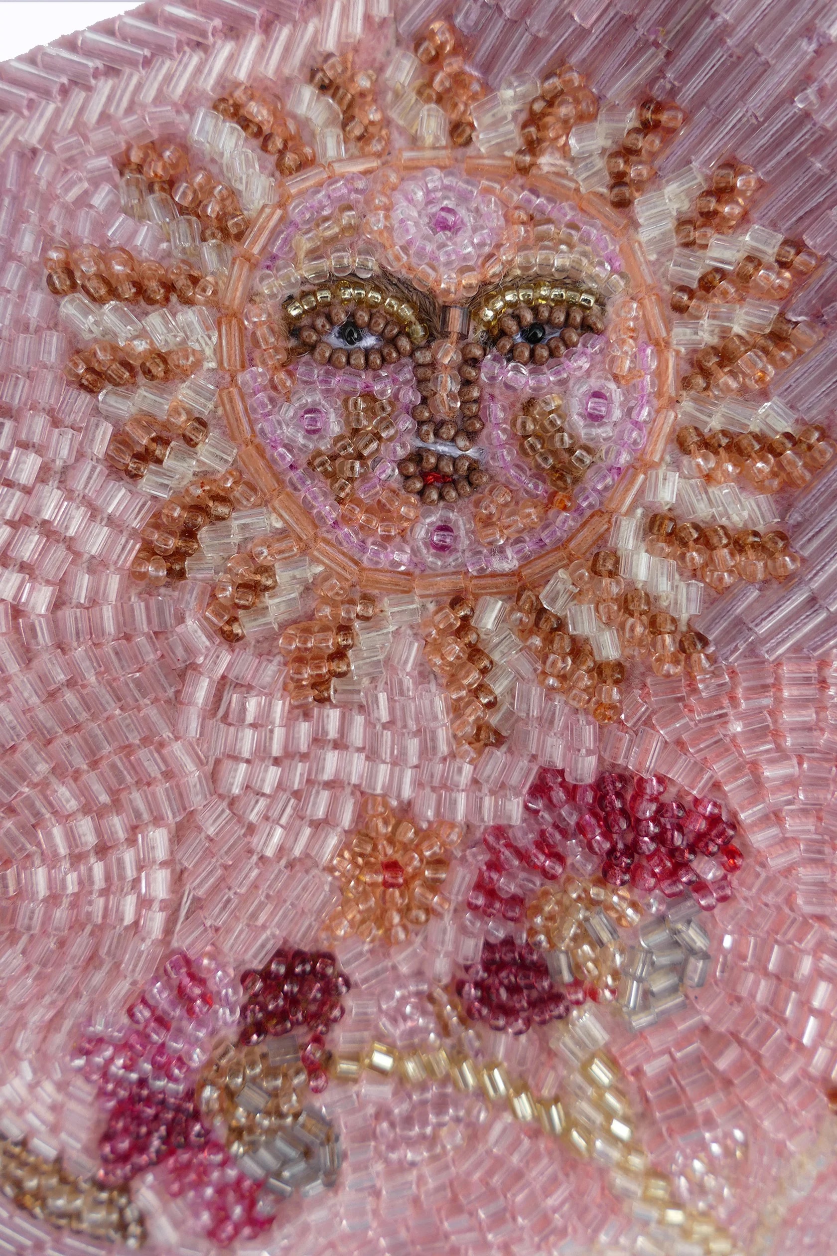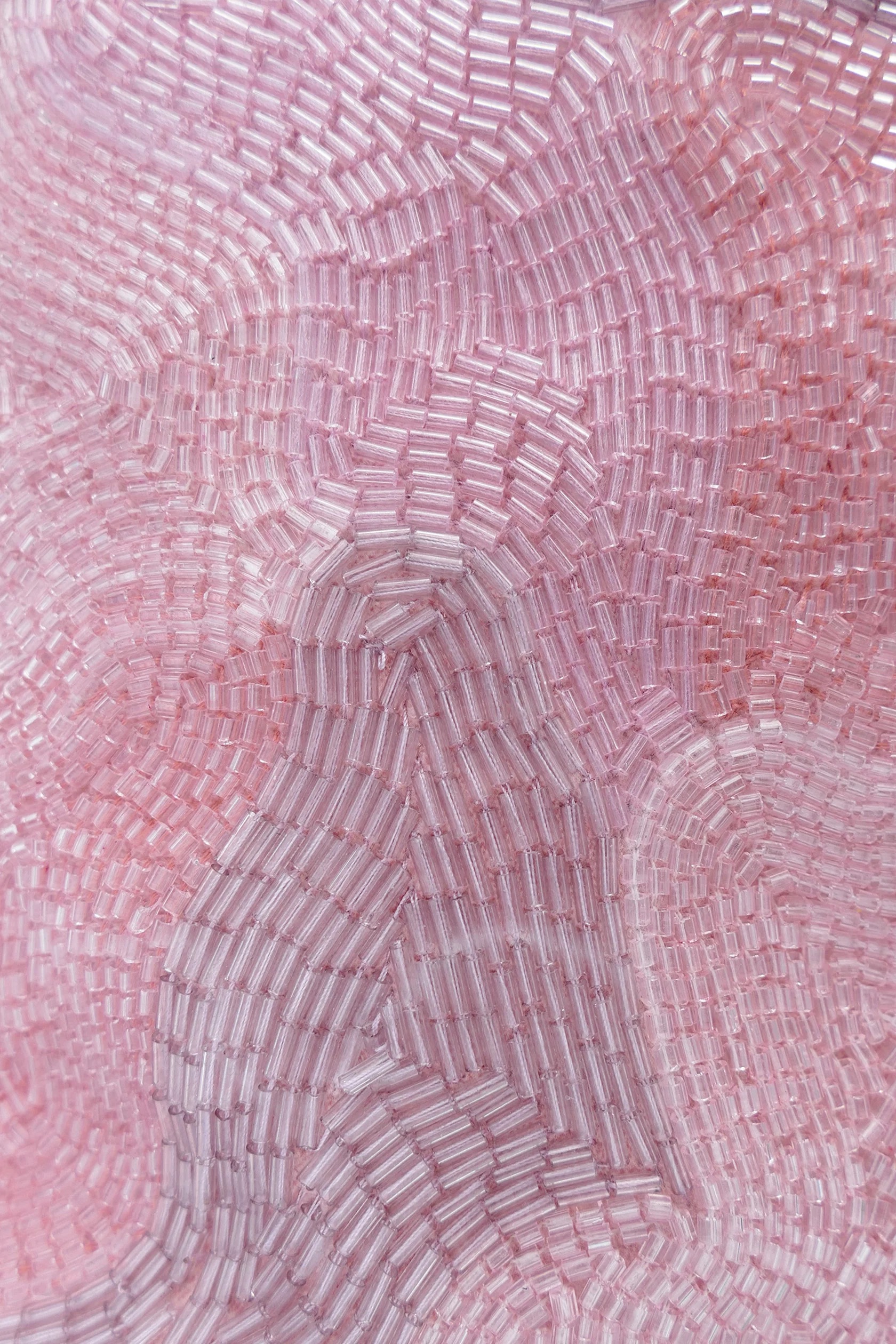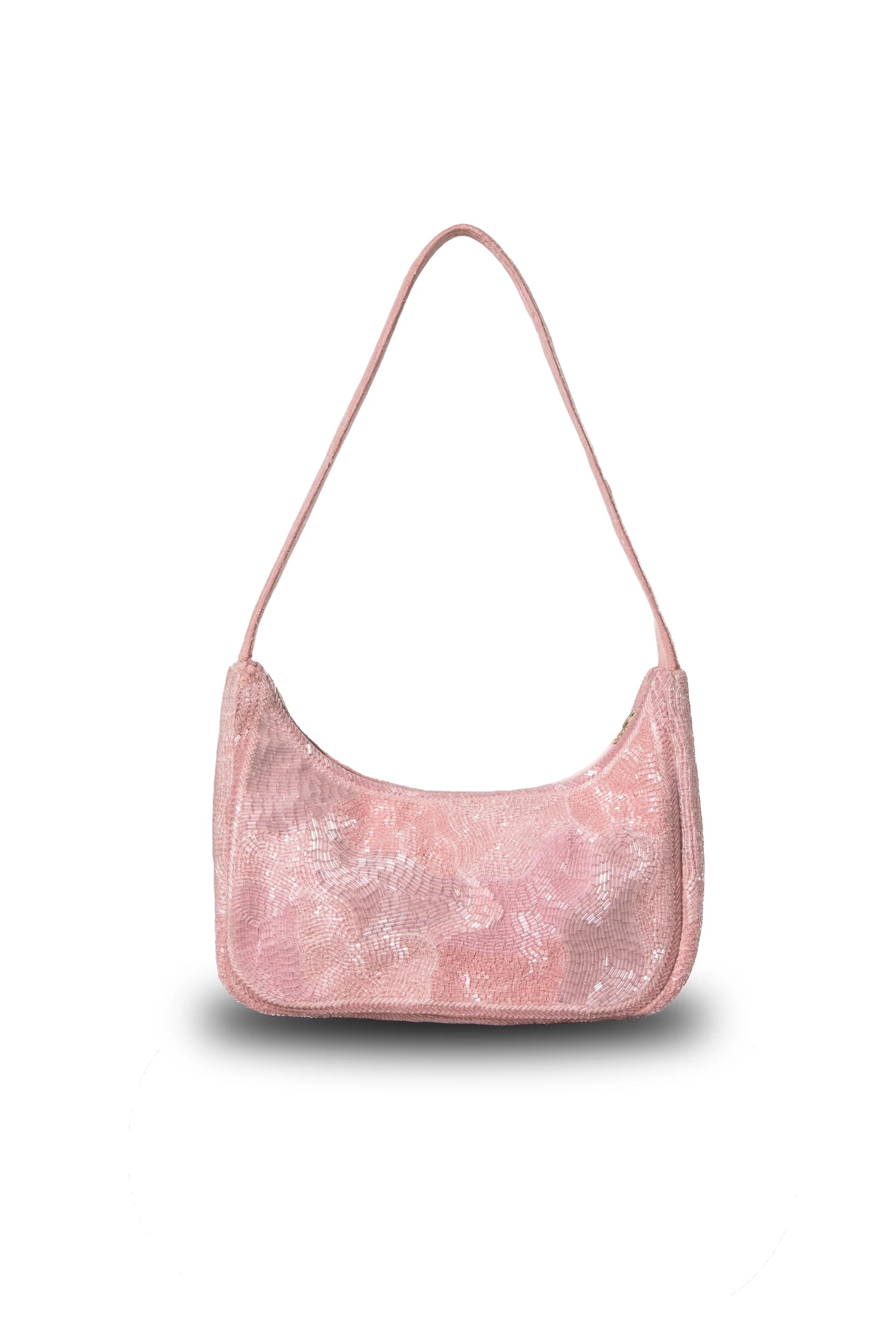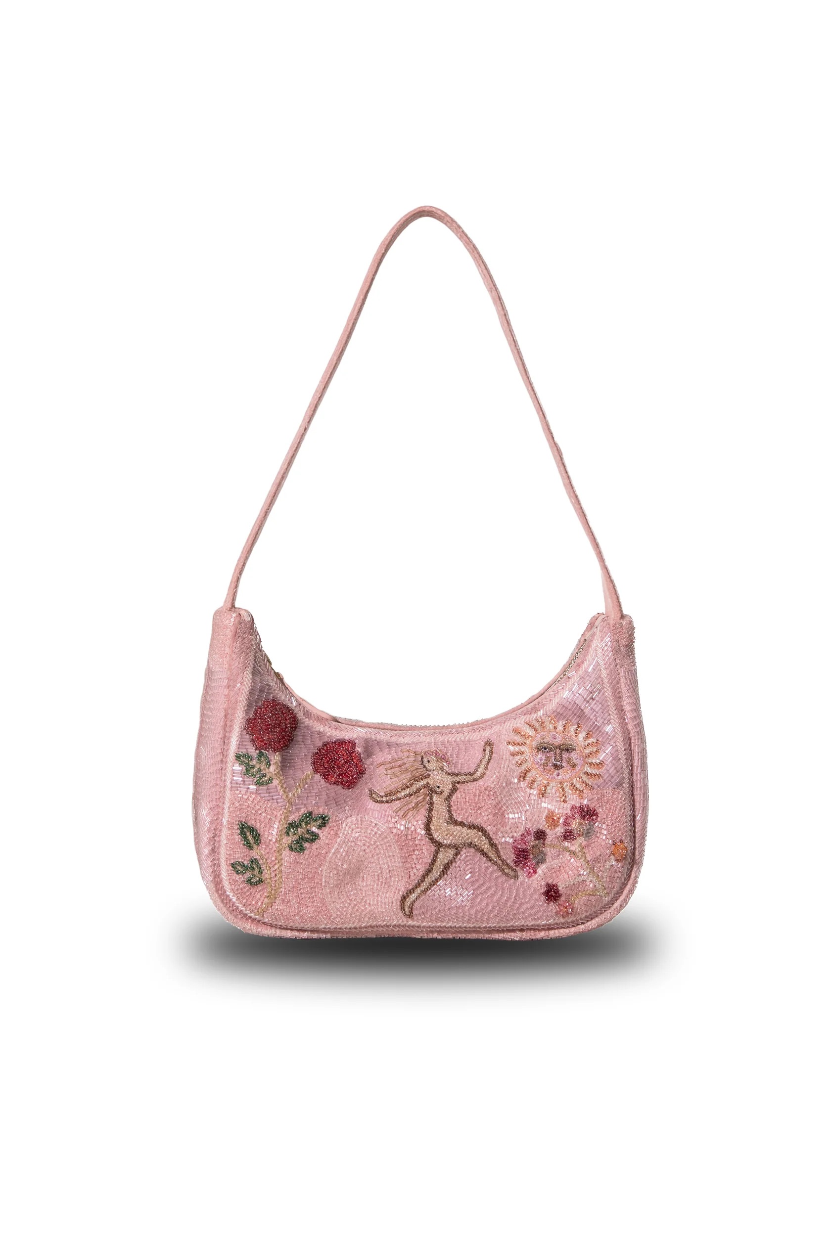 This shoulder bag features a romantic pattern with hand-embroidered shimmering beads. It includes a matching embroidered strap and a metal zipper. The bag also has a small inner pocket for essentials.