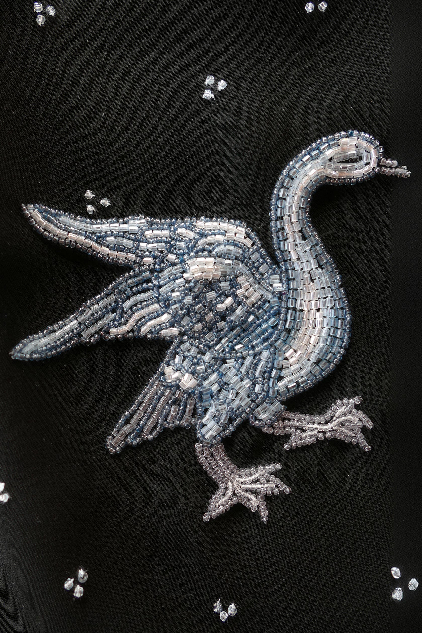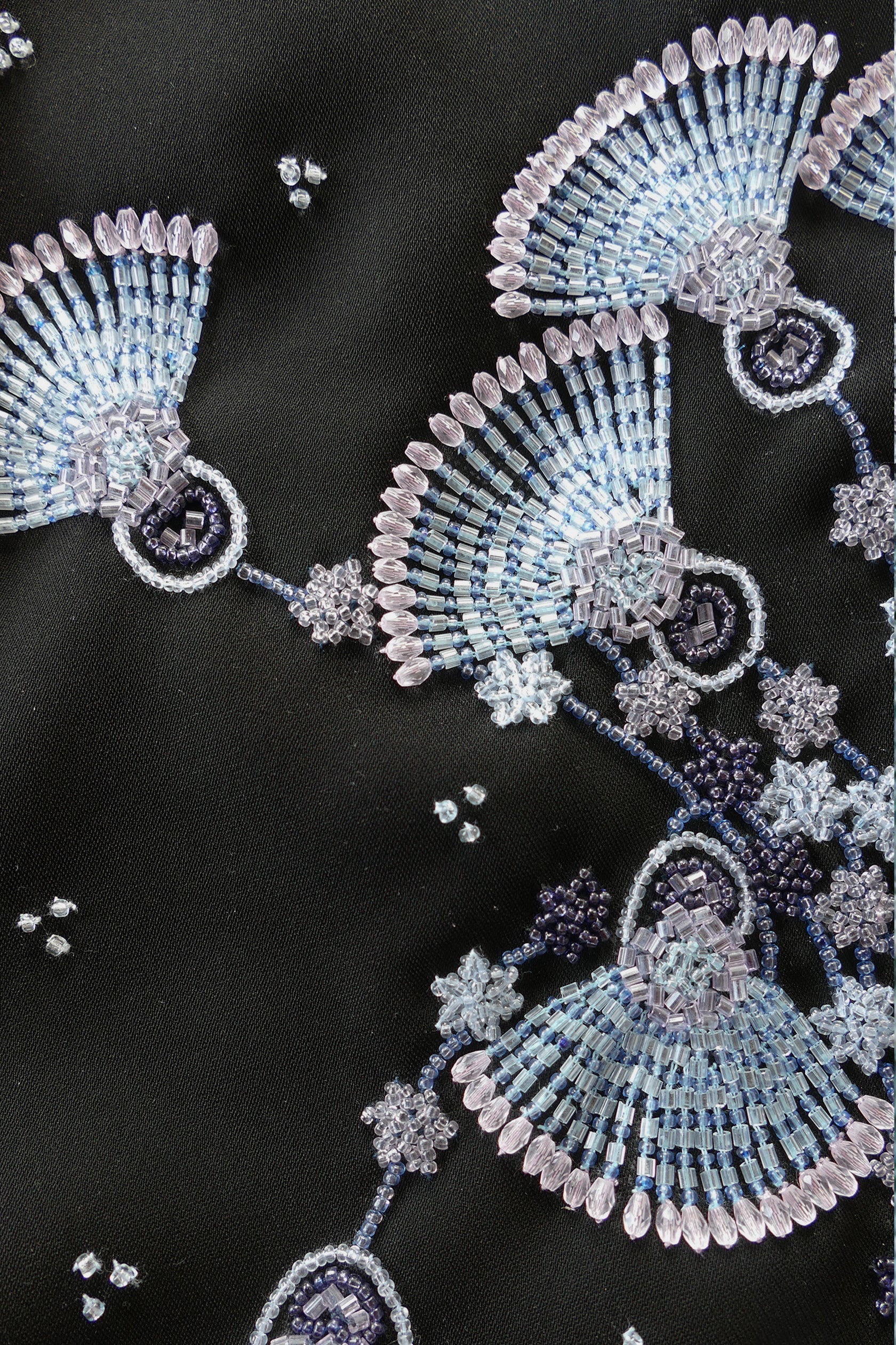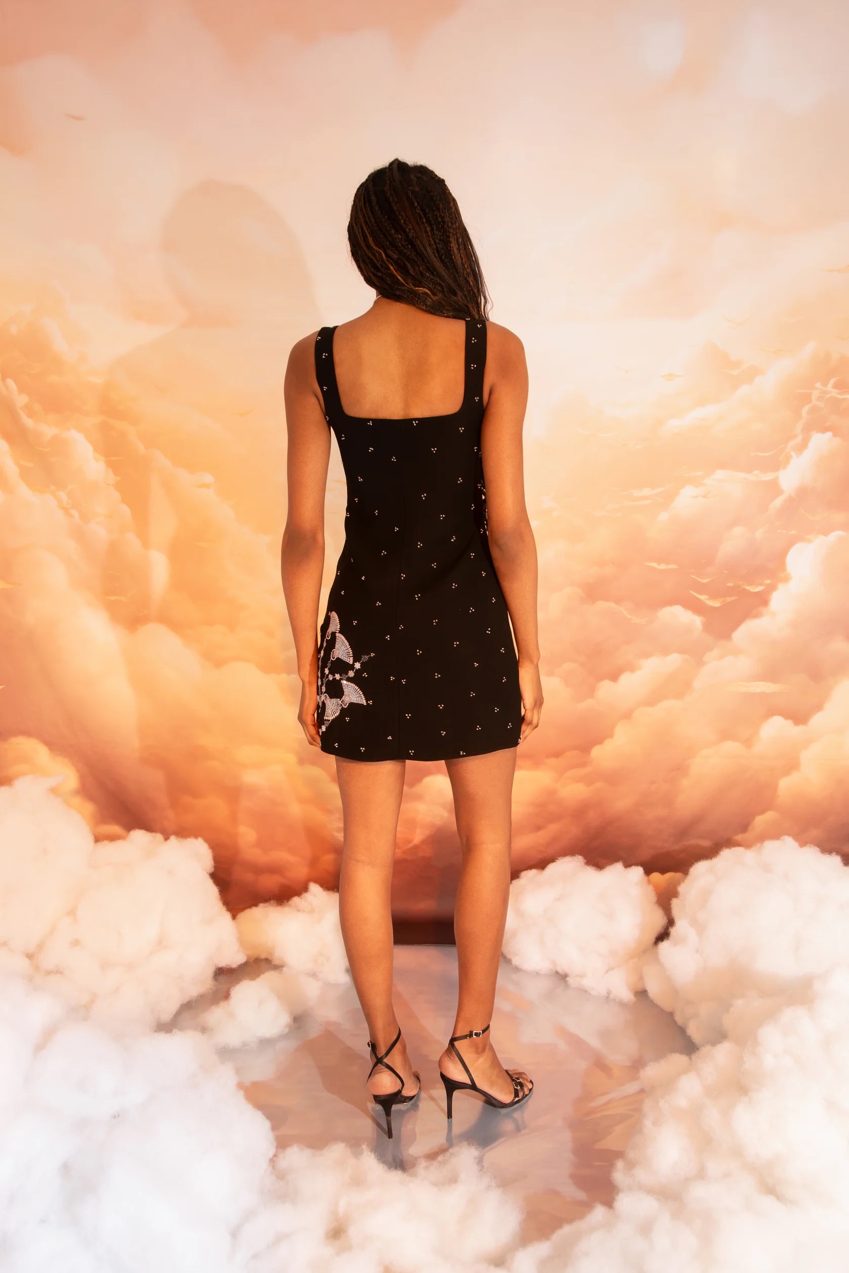 Features a mystical pattern hand-embroidered with shimmering beads. This short dress has a sweetheart neckline and a front slit.