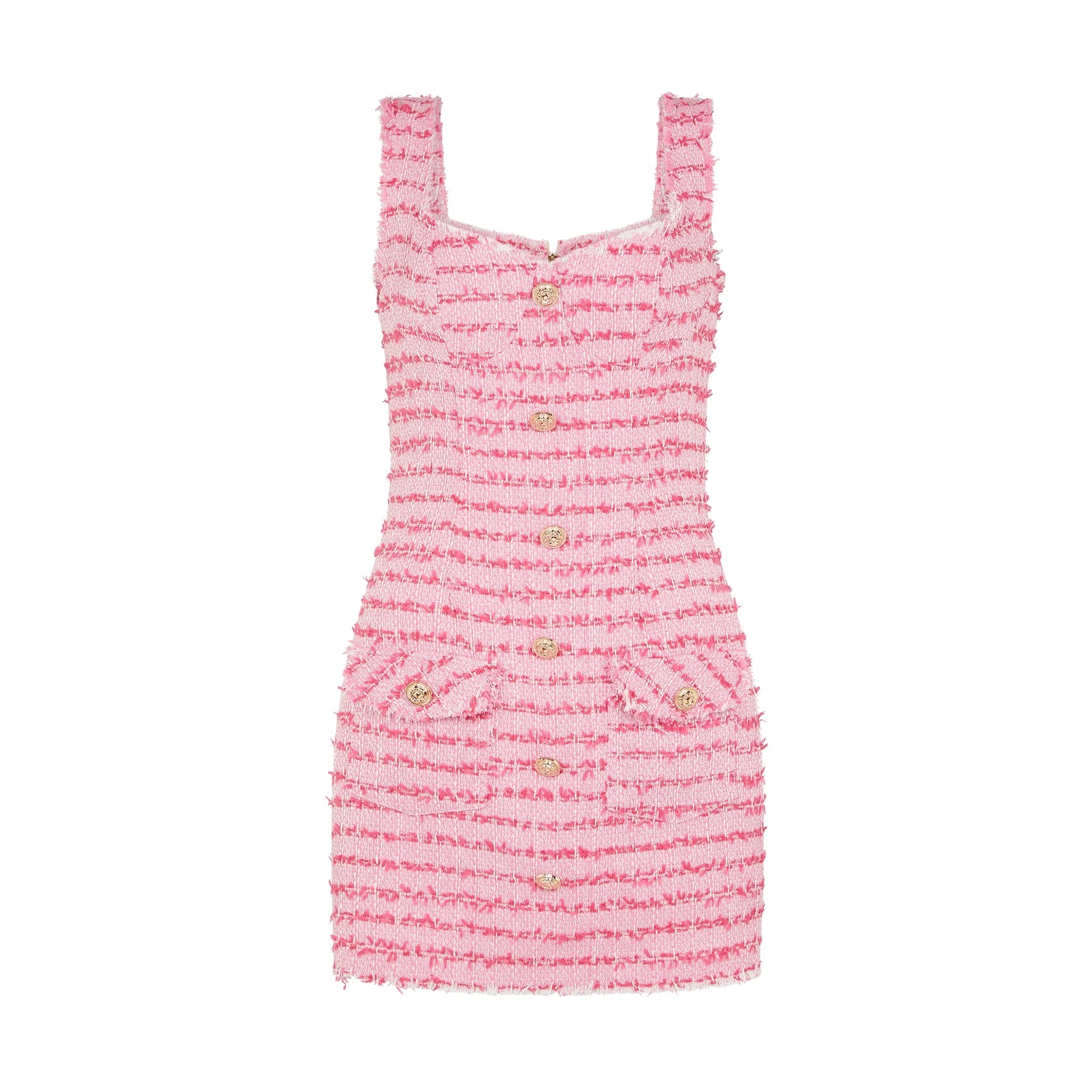This pink mini dress is tailored from tweed with frayed edges. It has a slim fit with a V-neckline and gold-tone buttons. Wear it with ballet flats or pumps.