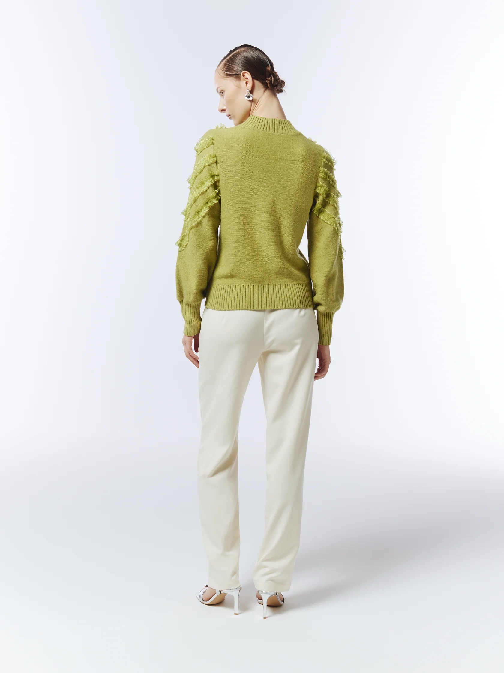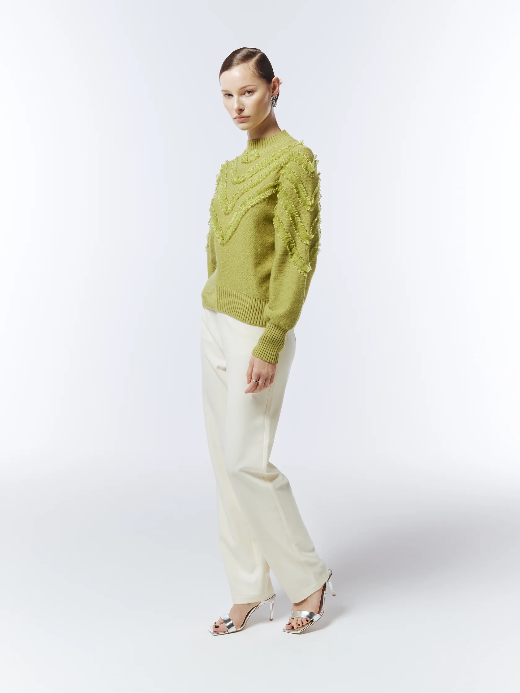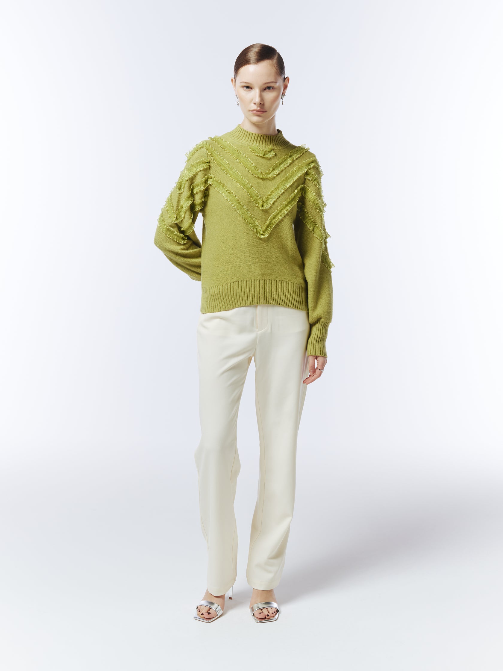 Features intricate chevron ruffle detailing integrated into the knit structure. It has a softly structured silhouette with ribbed trims and a mock neckline. Pair it with casual trousers or skirts for a polished look.