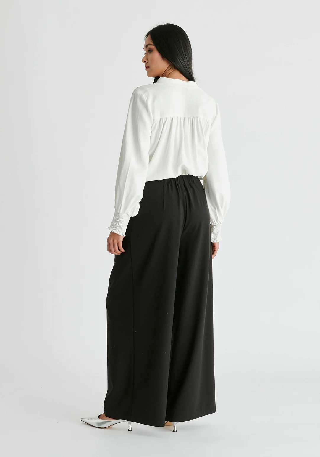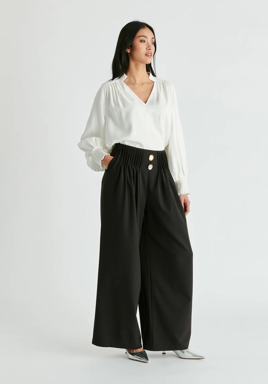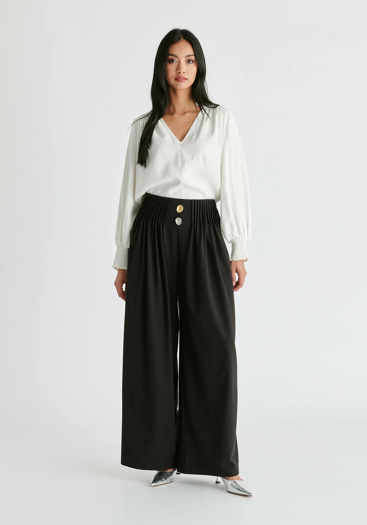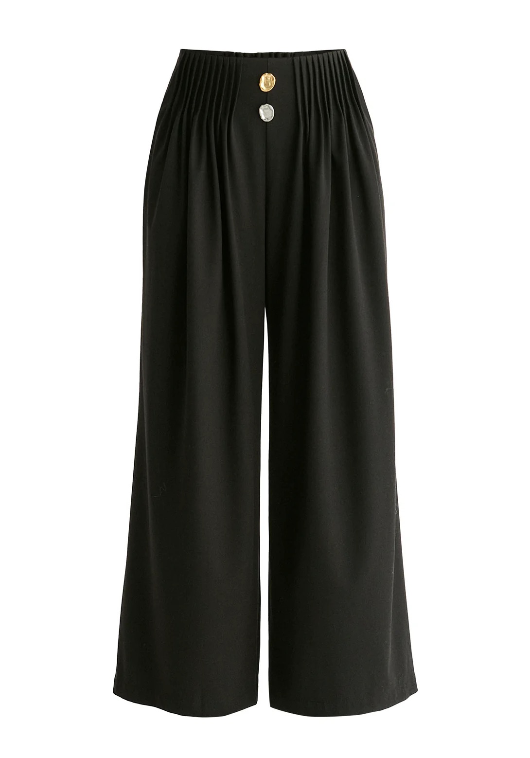 These wide-leg trousers feature an elegantly pleated waist and are adorned with artisanal-style silver and gold buttons. A side zip fastening ensures a sleek finish, and convenient side pockets are included. These trousers are perfect for work or a formal event.
