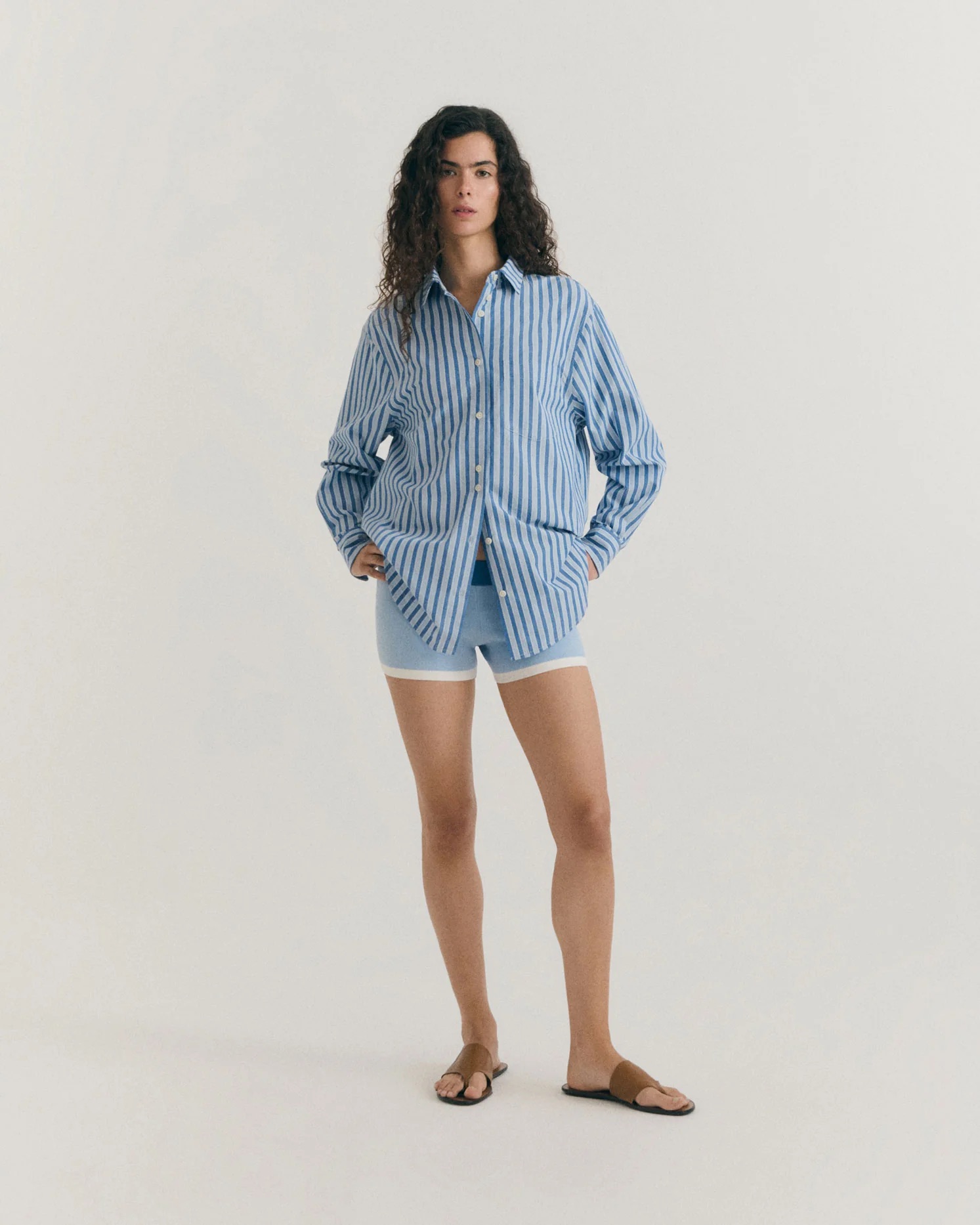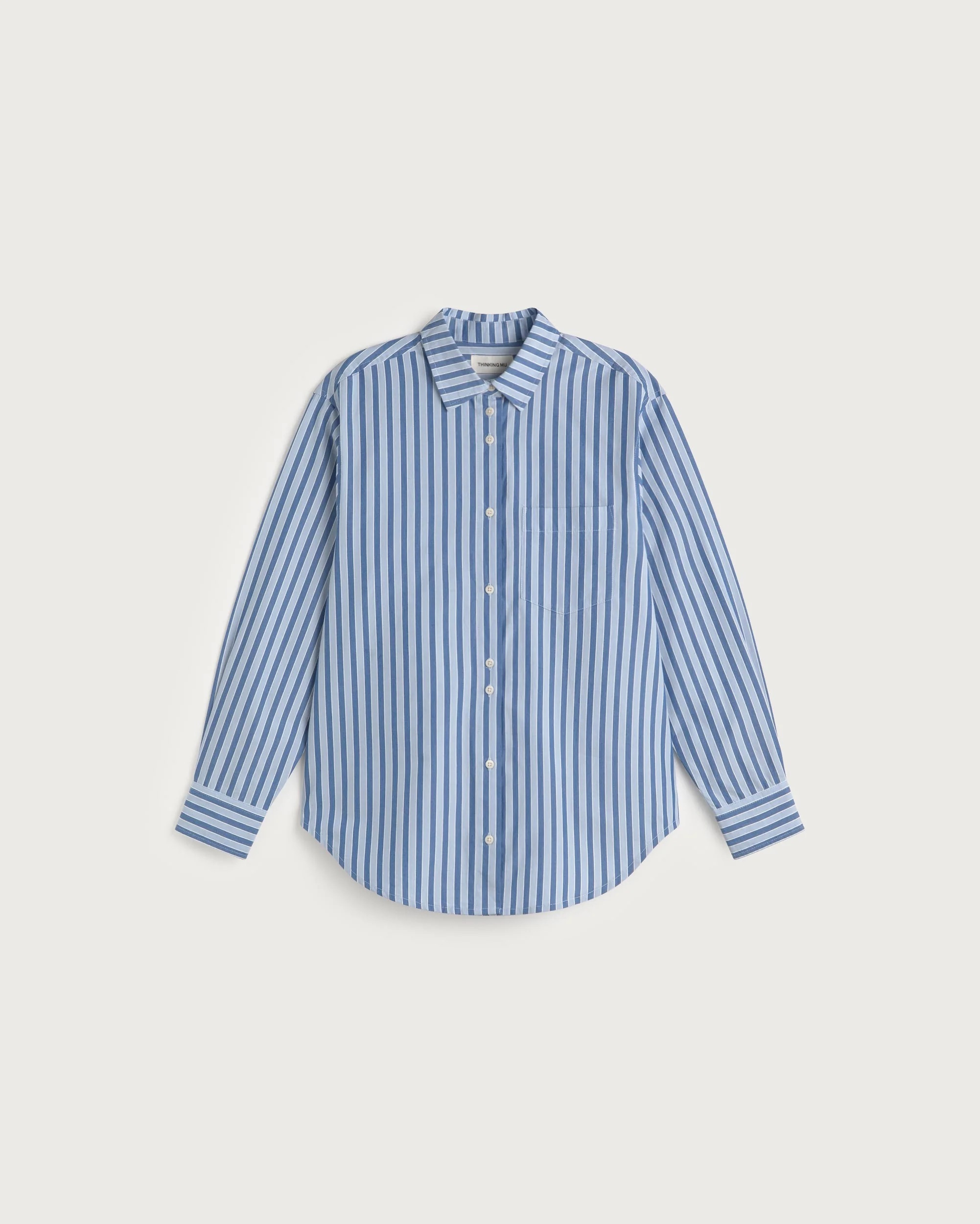 This oversize shirt is made of organic cotton. It features a shirt collar and long sleeves. The shirt has an oversize fit with front closure with buttons in an asymmetrical position.