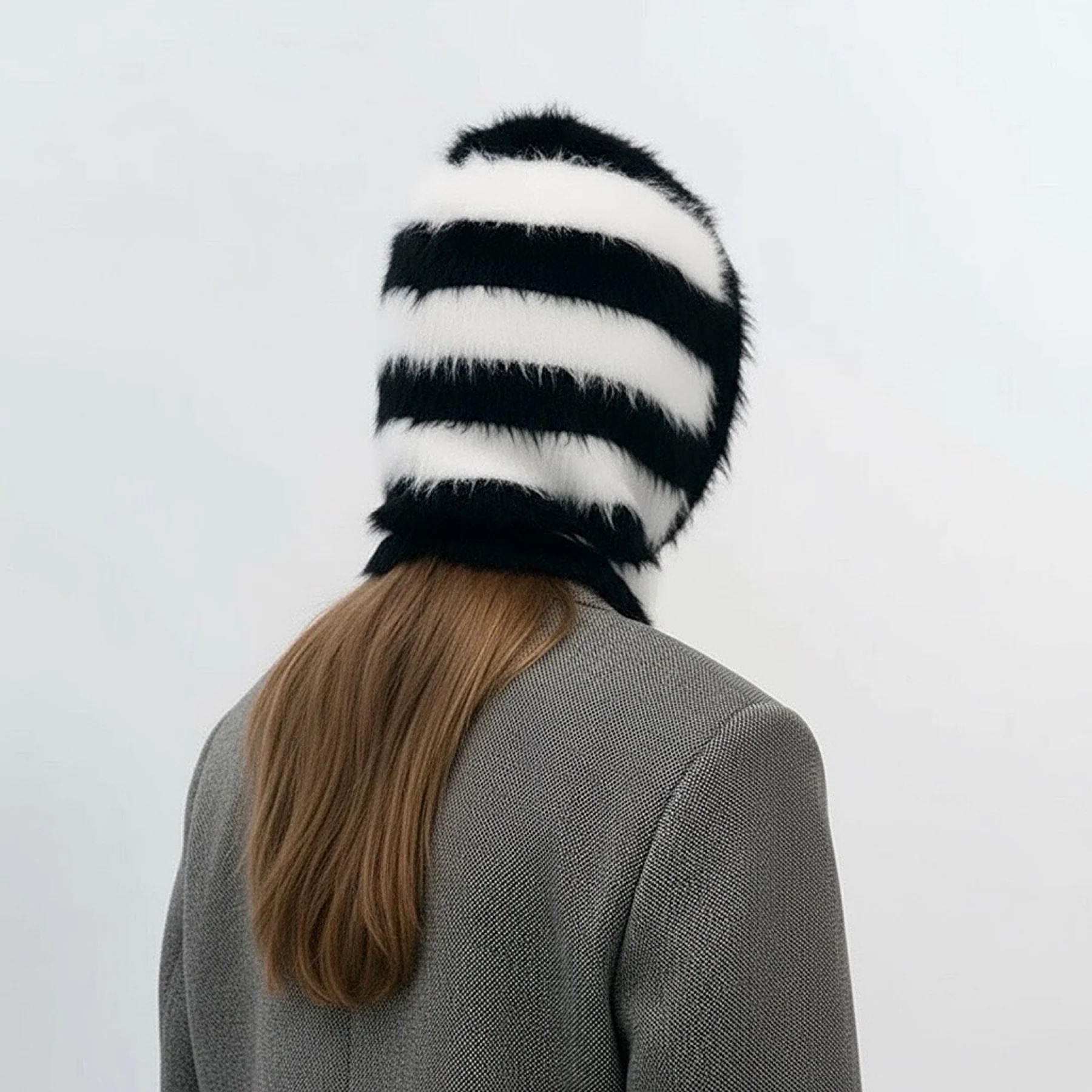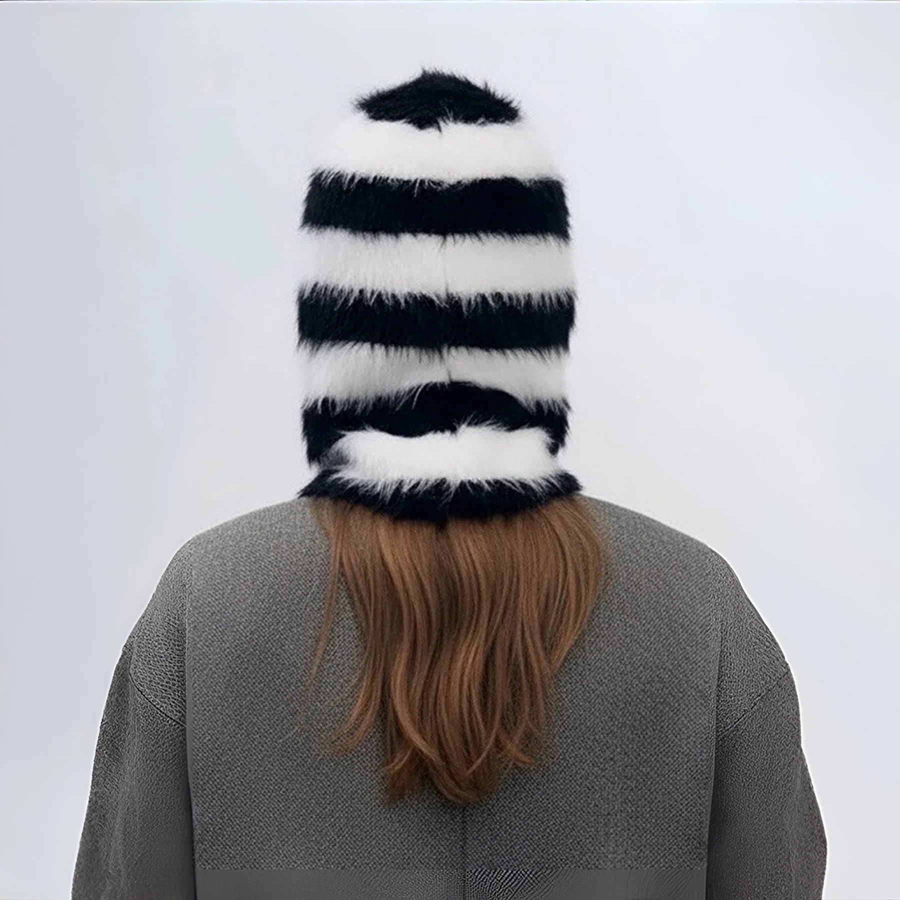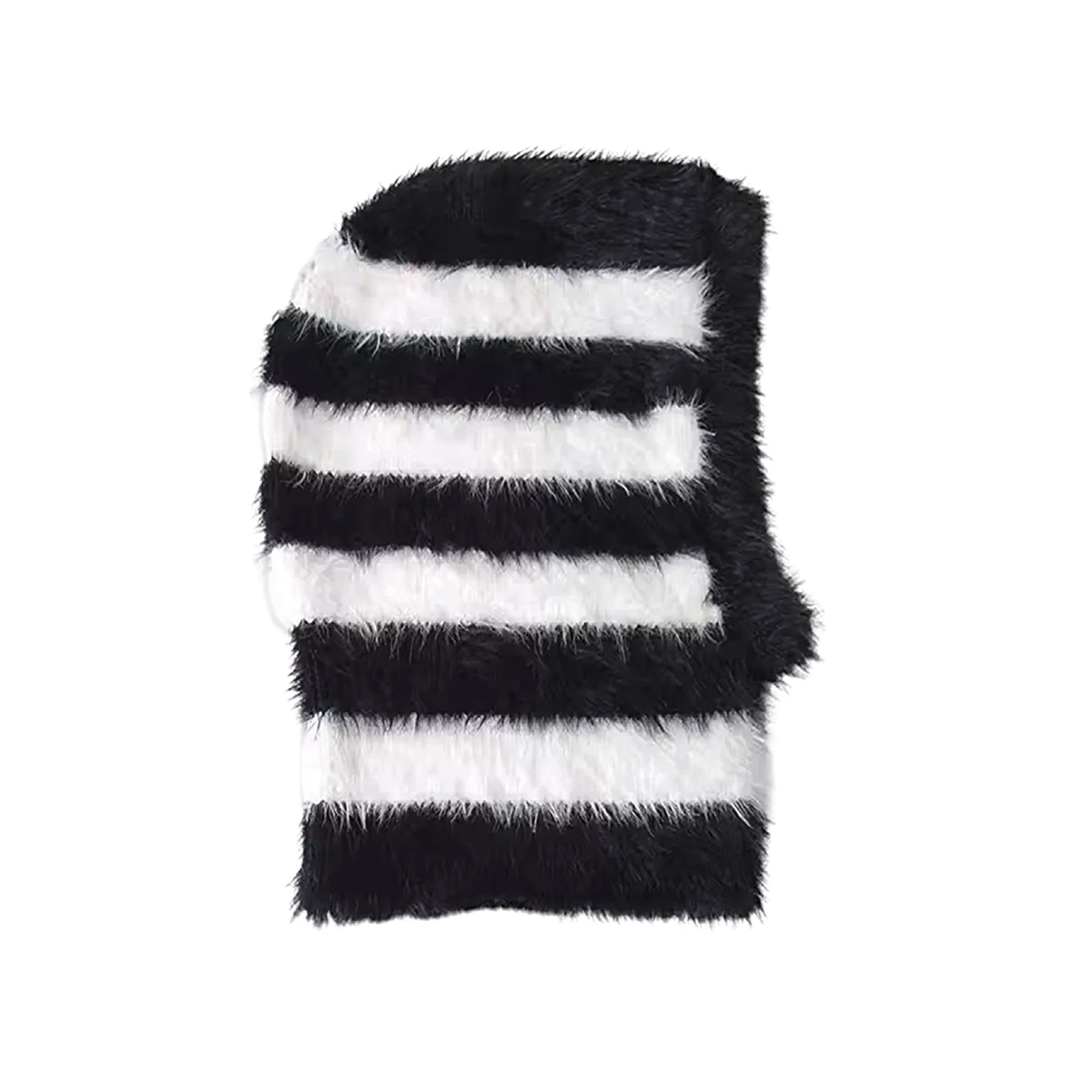 This black and white striped knit balaclava is a unisex accessory. It is made from a soft knit polyester, perfect for keeping you warm during winter. This one-size-fits-all balaclava is ideal for any contemporary look.