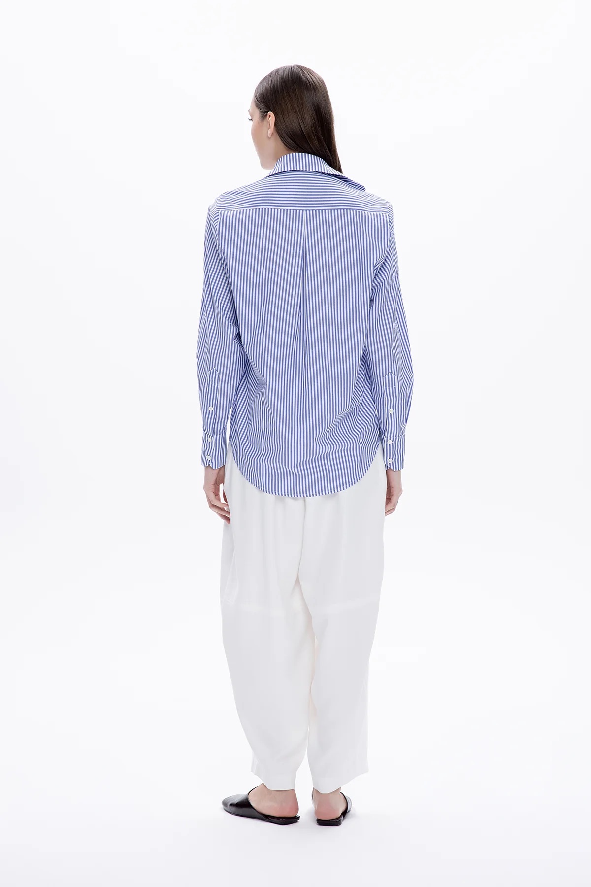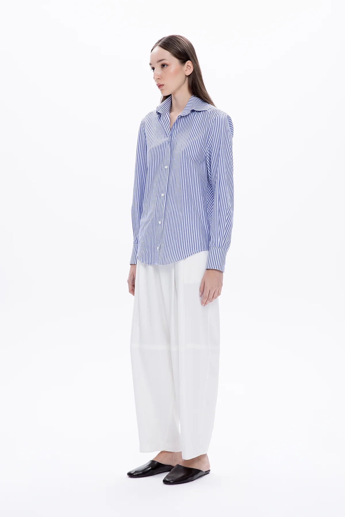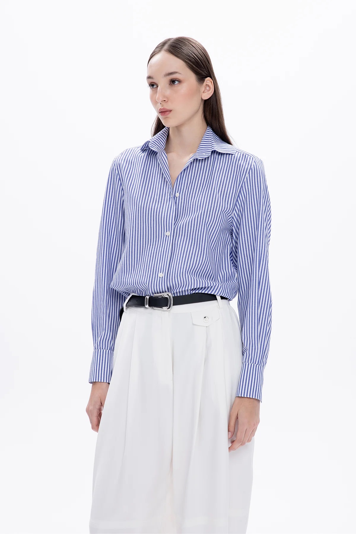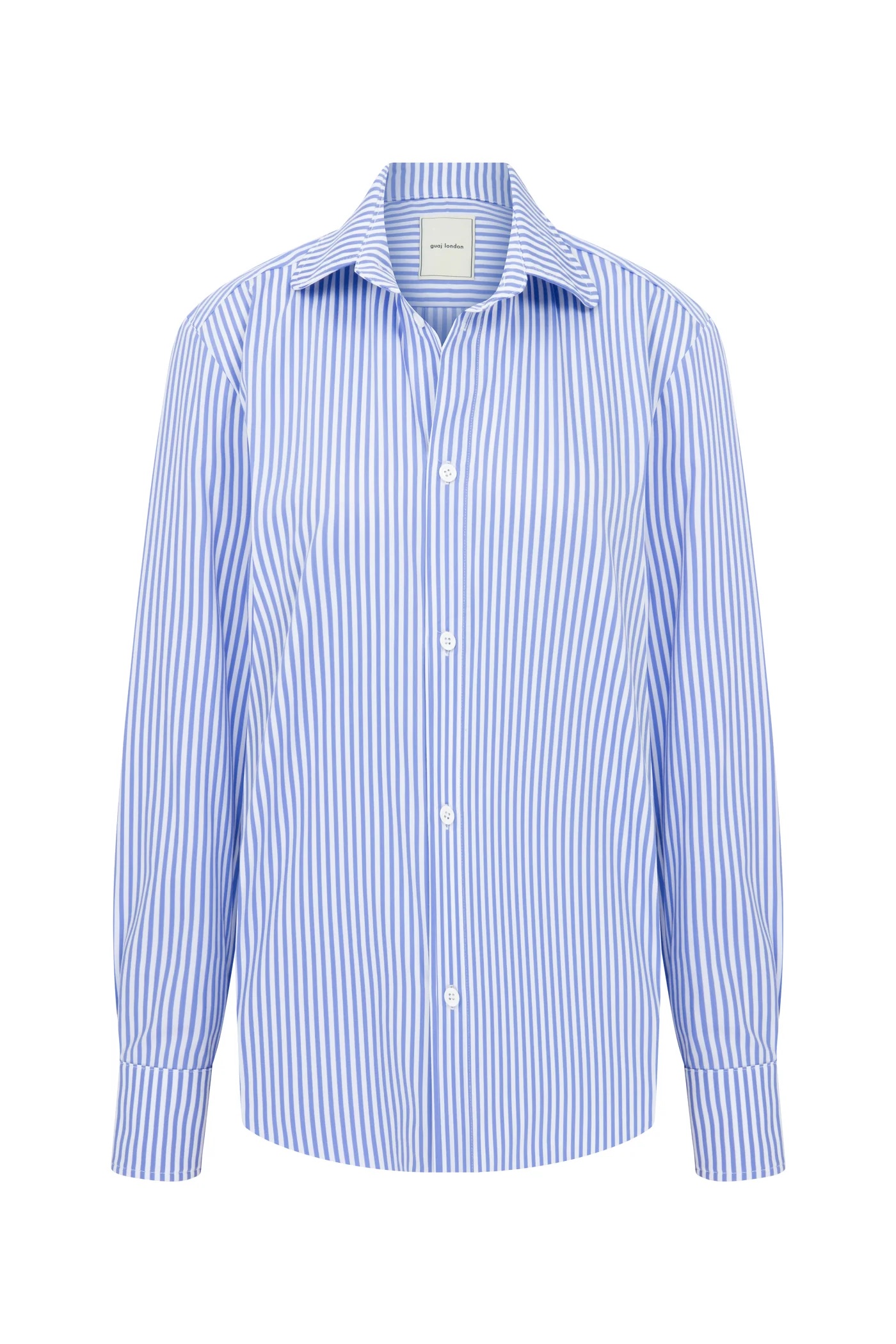 Crafted from 100% organic cotton, this shirt offers a breathable and soft-touch feel. The blue and white stripes create a classic aesthetic, while the relaxed silhouette ensures effortless style. It is designed for those who seek sustainability without compromising on elegance.
